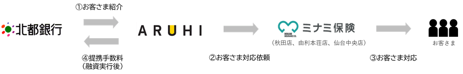 北都銀行はARUHIが取り扱う住宅ローン商品を希望するお客さまをARUHIへ紹介します。ARUHIは、ARUHIのフランチャイズ店である株式会社ミナミ保険(本社:秋田県秋田市、代表取締役社長:若林 信光)を通じ、お客さまに対して住宅ローン商品に関する具体的な説明、申込受付、契約面談や融資実行等の業務を行います。