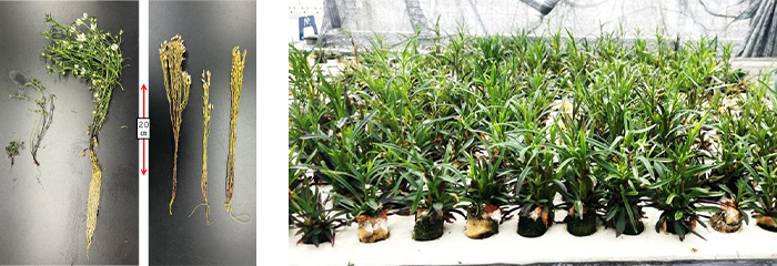 本研究により、土耕栽培では通常2年かかるセンブリの栽培期間が播種から収穫までを385日間(約1年)に短縮することができました。現在、栽培期間の更なる短縮と重量の増加に向けた研究を継続しています。これらの知見を踏まえ、今後も生薬の国産化に貢献する技術開発に繋げてまいります。