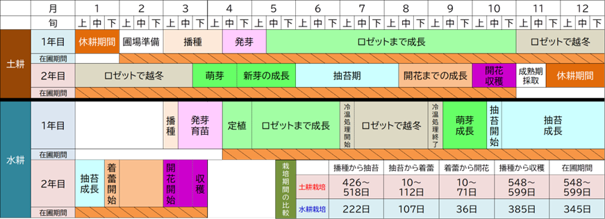 3.土耕栽培では2年で1作である栽培期間を約1年で1作にまで短縮できた(図3)