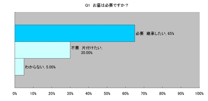 はじめに「お墓は必要ですか?」と質問したところ、「継承したい」(65%)が一番多く、「不要です。片付けたい」(30%)、と続き、「わからない」(5%)という結果となりました。
