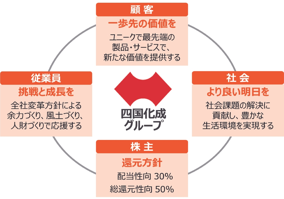 当社グループは2030年を最終年度とする長期ビジョン「Challenge 1000」を実践中です。積極経営の方針を明確に掲げ、設備投資や研究開発投資による成長のみならず、「四方よし」を具現化し、株主還元や社会貢献も含めた新しい企業集団に生まれ変わることを目指しています。