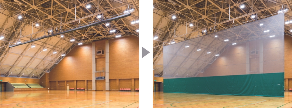 SIKIRUTOは、リモコンのボタンを押すだけで天井に格納されている幕が降り、空間を二つに分けることが出来る、大型電動間仕切りです。当社は1992年に第一号機を納入して以来、日本全国の学校や公共の体育館に納入してきました。