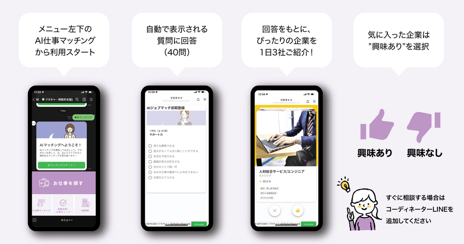 特別なアプリケーションのダウンロード不要で、LINEから「ヅカキャリ」の利用者登録をした上で、メインメニューの「AI仕事マッチング」からアクセスし39項目の質問に答えます。回答内容に基づいて、AIが利用者の性格や価値観を分析し適した企業を紹介します。