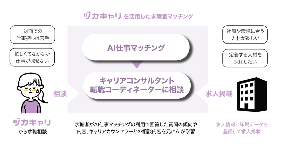 「ヅカキャリ」のAIは、国家資格であるキャリアコンサルタントとして5年以上の経験を有する複数の専門家の暗黙知に基づき、求職者に合った求人情報を探す過程の情報をデータ化し、学習を行っています。