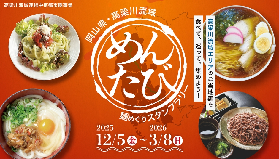 倉敷市観光課(所在地:岡山県倉敷市)は、高梁川流域エリア10市町の麺料理を巡るスタンプラリー「めんたび」を、令和7年12月5日(金)から令和8年3月8日(日)まで開催いたします。