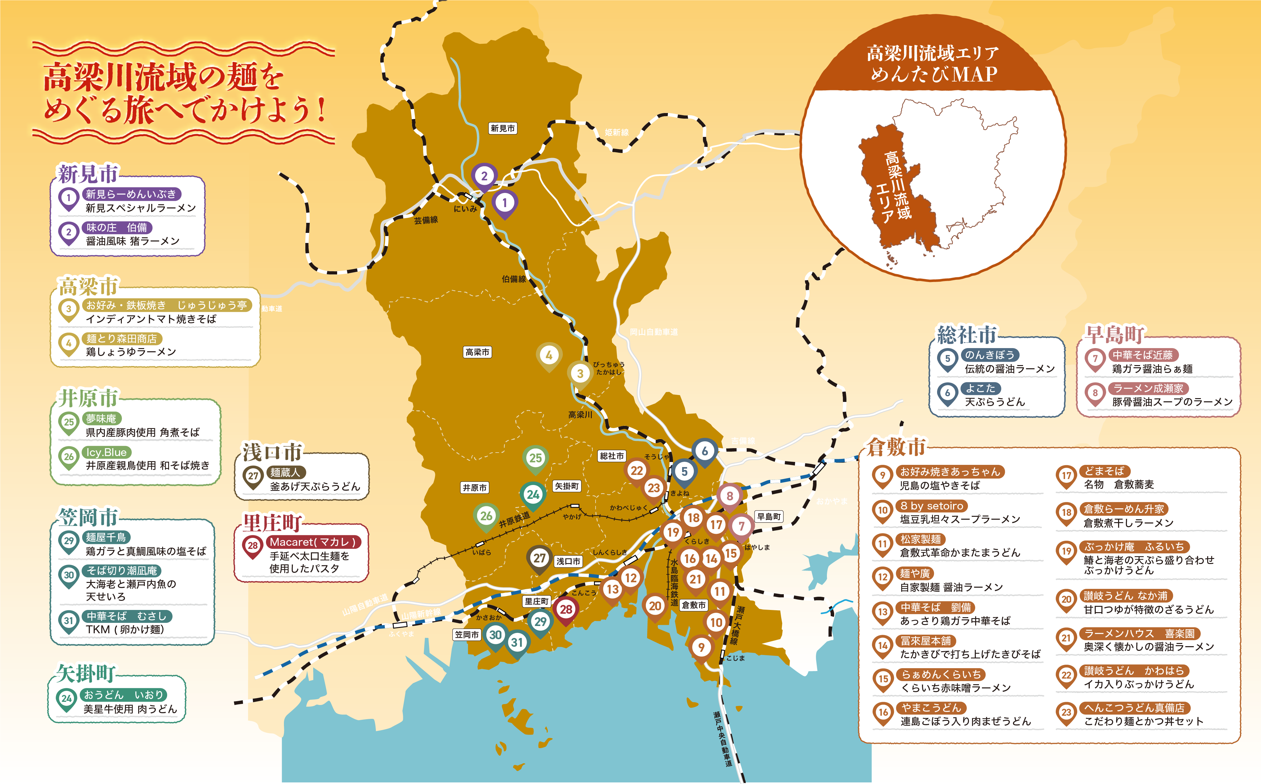 岡山県西部にある高梁川流域は、温暖少雨の気候と良質な土壌により、小麦栽培に適した地域。さらに瀬戸内海では、良質な塩が生産され、清らかな水にも恵まれていたことから、古くから製麺業が発達しました。こうして“麺どころ”としての文化が形づくられてきた高梁川流域ならではの麺料理をたくさんの人に味わっていただきたく、「麺」を巡るスタンプラリーを開催することとなりました。うどん、ラーメン、そば、パスタなど、高梁川流域の恵まれた風土が育んだ、特色ある様々な麺料理を楽しめます。