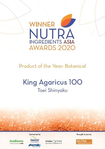 東栄新薬株式会社(所在地:東京都三鷹市、代表取締役:元井 章智)は、当社のキングアガリクス製品【キングアガリクス100】が「アジア太平洋地域で最高のサプリメント*」を表彰する「NutraIngredients Asia Awards 2020, Product of the Year - Botanical」を2020年9月22日に、受賞しましたことをお知らせいたします。