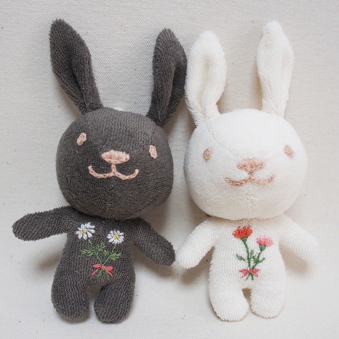 うさぎのおなか部分に、白うさぎにはカーネーションを、黒うさぎにはマーガレットを刺繍。