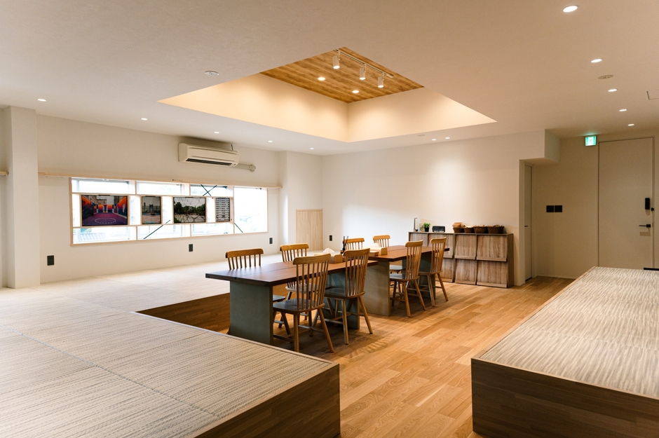 宿泊は1日1組のみで、最大22名まで利用可能です。合宿のような一体感を生むつくりが特徴で、チームやご家族での利用を想定しています。フロア内にはバスケットボール関連の写真が展示され、滞在中にballaholicのカルチャーを感じられる空間として整えられています。