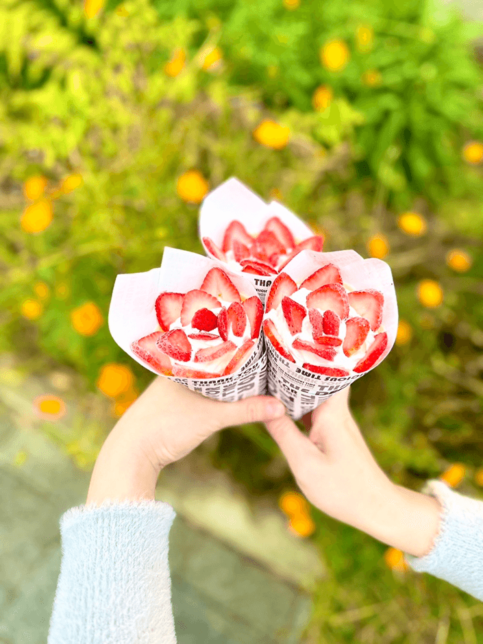 「幸せを呼ぶブーケ」は真上から見ると、クリームに乗ったスライスしたいちごが花びらのよう。冷凍庫から取り出して少しかためのままでも美味しく食べられ、食べ進めるとだんだん溶けて通常のクレープのような柔らかさになります。甘すぎないクリームはとろける食感で、甘酸っぱいいちごが絶妙にマッチした本格派スイーツです。より美味しく食べられるように味にもこだわっており、クリームは5種類、プレーンのホイップクリーム、塩キャラメル、カスタード、チョコカスタード、チョコレートから選べます。口コミなどで人気となり百貨店の催事に呼ばれることも増え、行列ができてすぐに品切れになる会場もあります。
