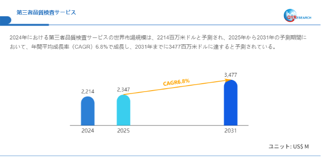 QYResearchが発表した新たな市場調査レポート「第三者品質検査サービス―グローバル市場シェアとランキング、全体の売上と需要予測、2026~2032」によると、世界の第三者品質検査サービス市場規模は2024年の約2214百万米ドルから2025年の2347百万米ドルへと順調に拡大すると見込まれ、予測期間中は年平均成長率(CAGR)6.8%で成長し、2031年には3477百万米ドルに達すると予測されている。
