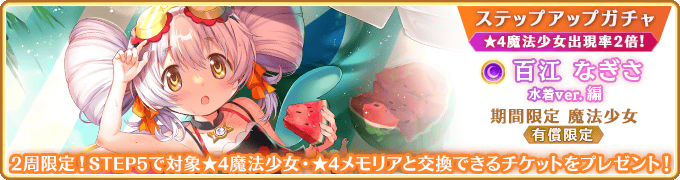蒼樹うめ描き下ろしのキャラクターが多数登場するスマートフォンゲーム『マギアレコード 魔法少女まどか☆マギカ外伝』(iOS/Android/Windows向けアプリ 基本プレイ無料 ※一部アイテム課金あり)は、4月22日16:00より、『期間限定 ユゥ ピックアップガチャ』『期間限定 百江なぎさ ピックアップガチャ』『期間限定 百江なぎさ 水着ver. ピックアップガチャ』『有償限定 ステップアップガチャ ユゥ編』『有償限定 ステップアップガチャ 百江なぎさ編』『有償限定 ステップアップガチャ 百江なぎさ 水着ver.編』および、イベント『百江なぎさは願いを叶えた』の開催を予定しております。