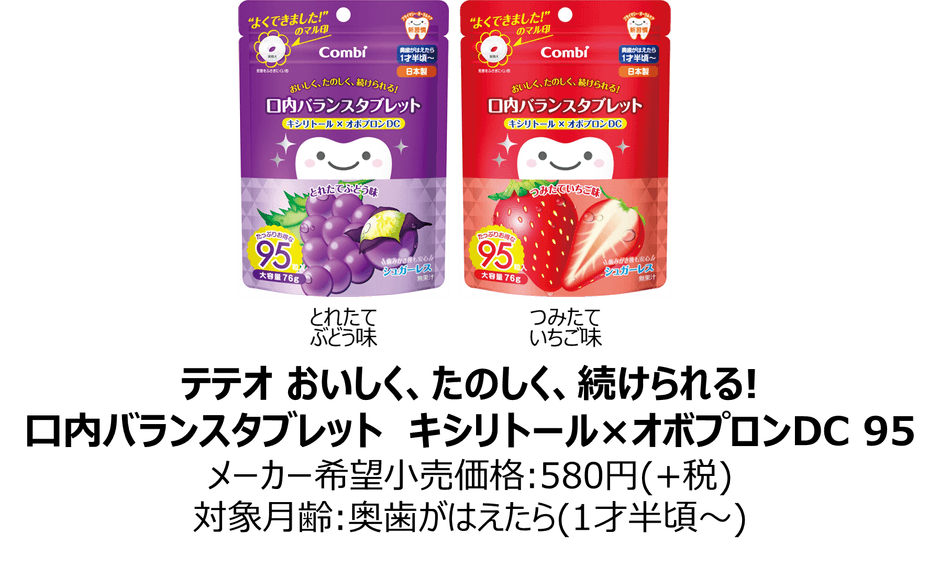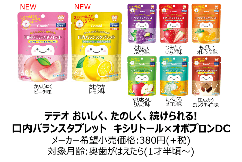 コンビ株式会社は、お子さまが「おいしく、たのしく、続けられる」ことをテーマに、乳歯期からお口の健康を考えた「口内バランスタブレット」の新製品、さわやかレモン味とかんじゅくピーチ味を2019年8月上旬より、全国のベビー用品専門店やGMSなどで販売いたします。