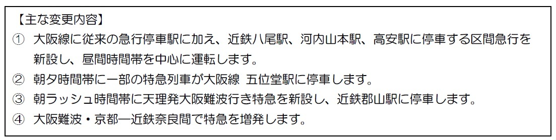 昼間時間帯を中心に「区間急行」を新設します。また、昼間時間帯のダイヤパターンを見直し、河内国分駅および大和八木駅で区間急行と普通が連絡するわかりやすいダイヤに変更します。