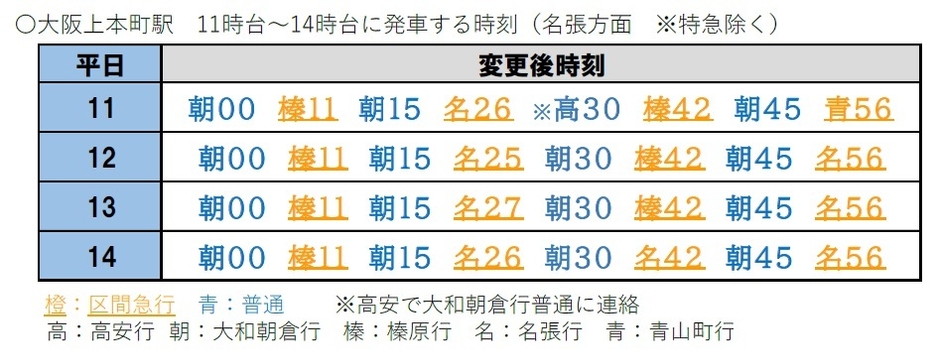 普 通 毎時 大阪上本町―大和朝倉間4本
