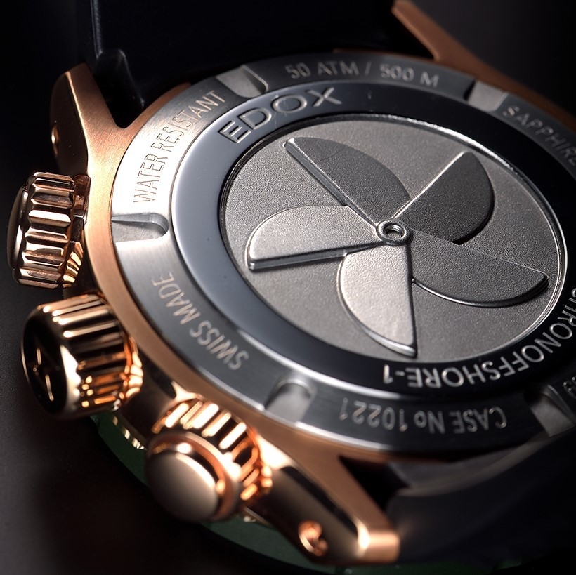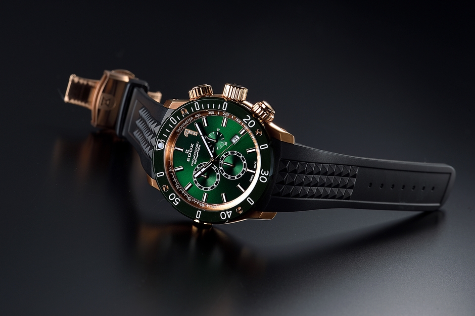 クオーツ、キャリバーEDOX102/防水500m/316Lステンレススティール ケース(ピンクゴールドPVD加工)/グリーンダイアル/ケース径45mm/ラバーストラップ/世界限定300本