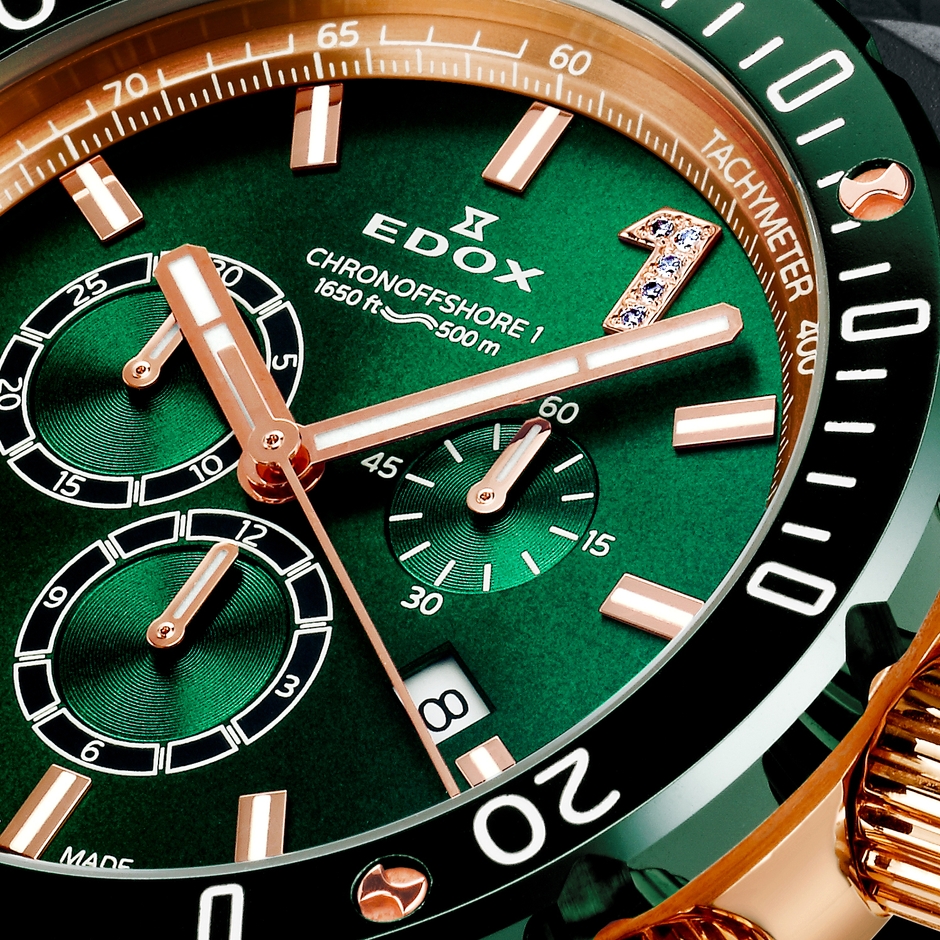 今回発表するクロノオフショア1の新作ウォッチは、パワフルな存在感に加え、エレガントなディープグリーンの文字盤、同系色のベゼル、ダイヤモンドを配した“1”のアラビアインデックスと、ピンクゴールドPVDを施したケースでエレガントさをプラスしました。