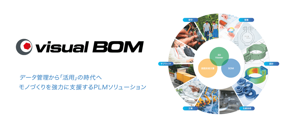 Visual BOMは、組立型製造業の設計成果物であるBOM(部品表)に、CADを持たない部門でも扱うことができる超軽量な3Dデータ(XVL)を加えて管理する、特許技術を搭載した唯一無二のPLMシステムです。これにより、製品開発プロセスにおける、設計とその後工程との正確で迅速なコミュニケーションを実現します。また、類似部品の検索、設計変更箇所の比較、部品のコストによる色分けなど、BOMと3Dデータを活用した機能も数多く実装しており、製品開発プロセスの効率化と高度化を実現します。