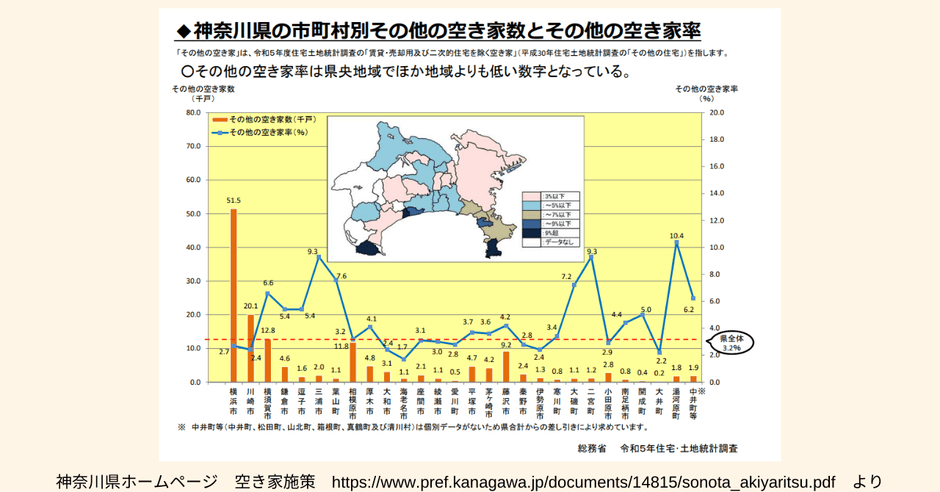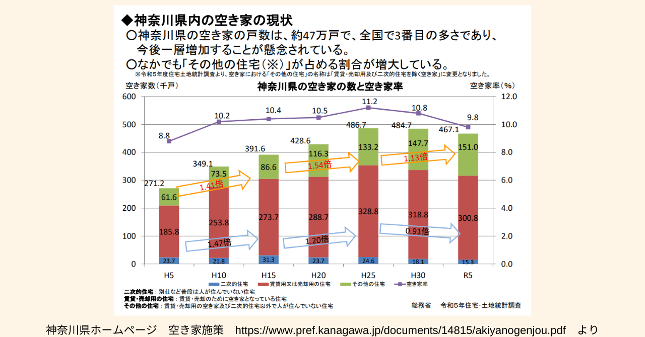 神奈川県では、賃貸・売却用の空き家及び二次的住宅以外で人が住んでいない住宅が占める割合が増大傾向にあり、横浜市が最も多いというデータが公表されています。