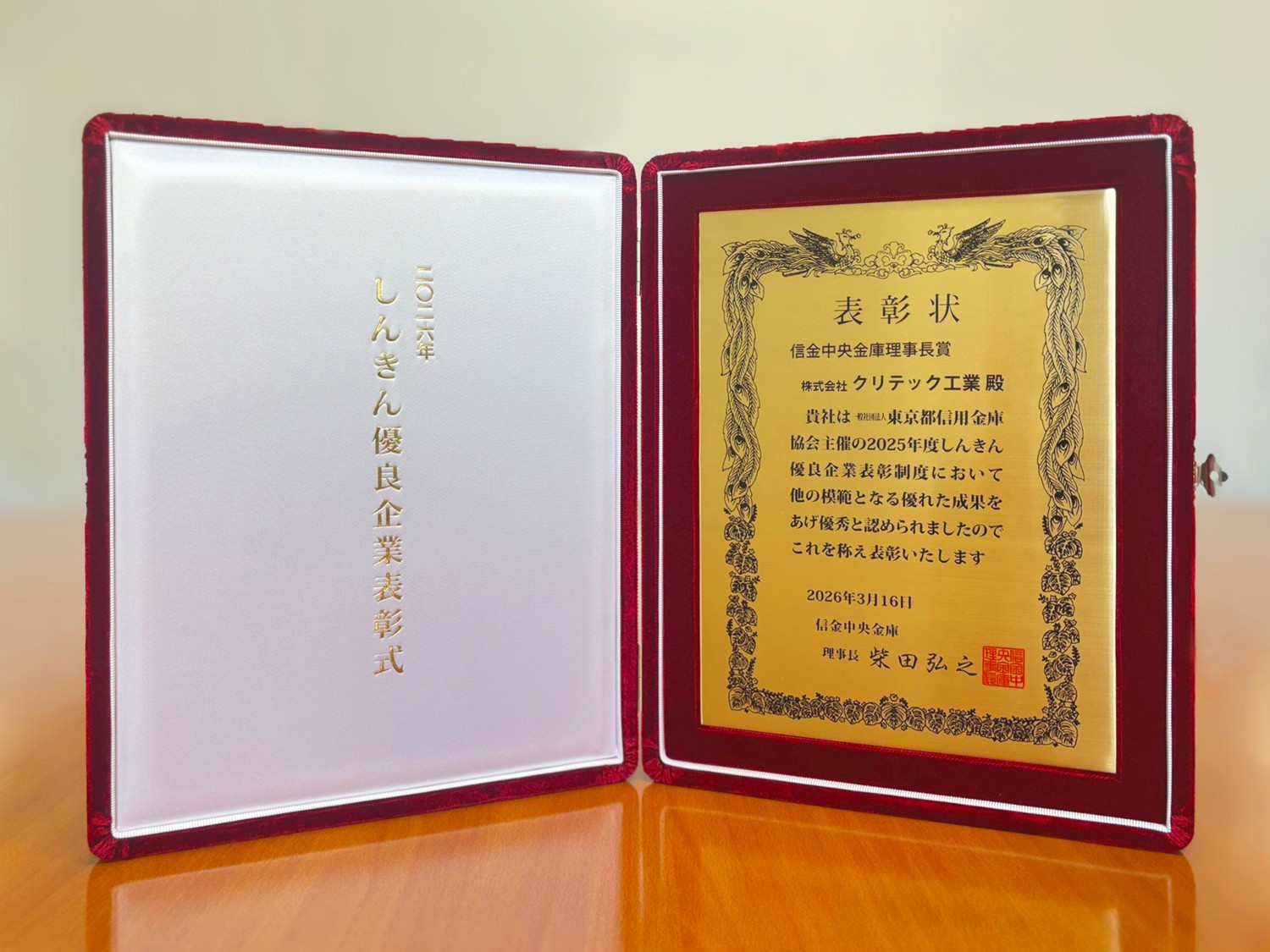 橋梁用伸縮装置メーカー・株式会社クリテック工業(代表:若林勇二/本社:東京都港区)は、2026年3月16日に開催された「2026年しんきん優良企業表彰」において、「信金中央金庫理事長賞」を受賞いたしました。