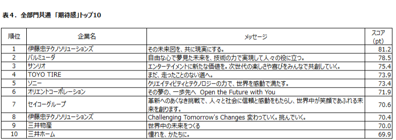 ・「期待感」:伊藤忠テクノソリューションズのブランドメッセージ「その未来図を、共に現実にする。」が81.2pt(表4)。