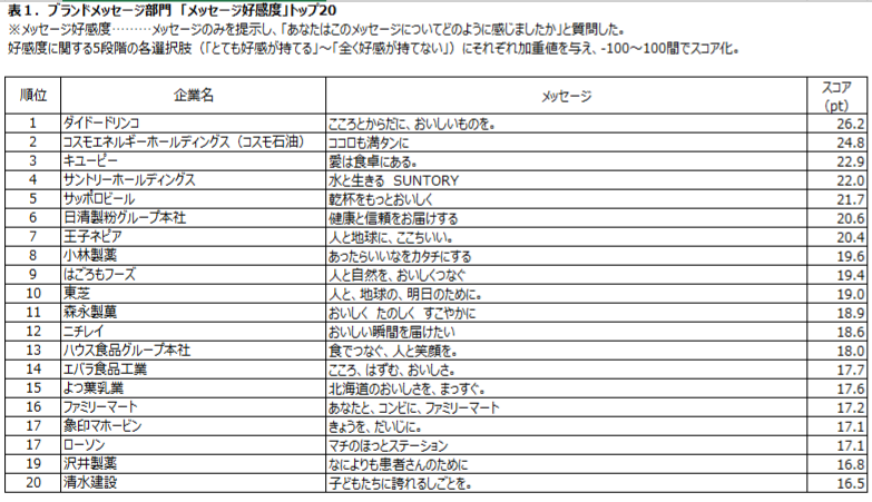 過去、「お口の恋人」(ロッテ)、「あなたと、コンビに、ファミリーマート」(ファミリーマート)、「ココロも満タンに」(コスモエネルギーホールディングス)のようなメッセージが高評価だった。このような企業メッセージに対して、毎年、2万人以上の一般生活者が評価している