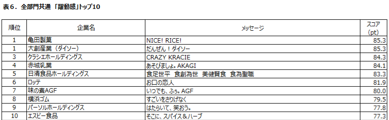 ・「躍動感」:亀田製菓のブランドメッセージ「NICE! RICE!」とダイソーのブランドメッセージ「だんぜん!ダイソー」が85.3pt(表6)の同点で首位。