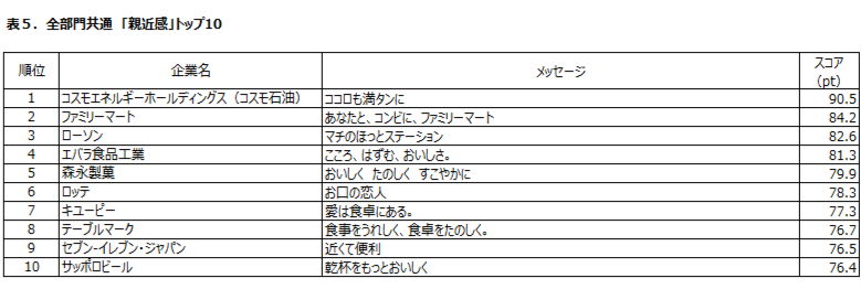 ・「親近感」:コスモエネルギーホールディングスのブランドメッセージ「ココロも満タンに」が90.5pt(表5)。4つの指標の中で唯一9割台。