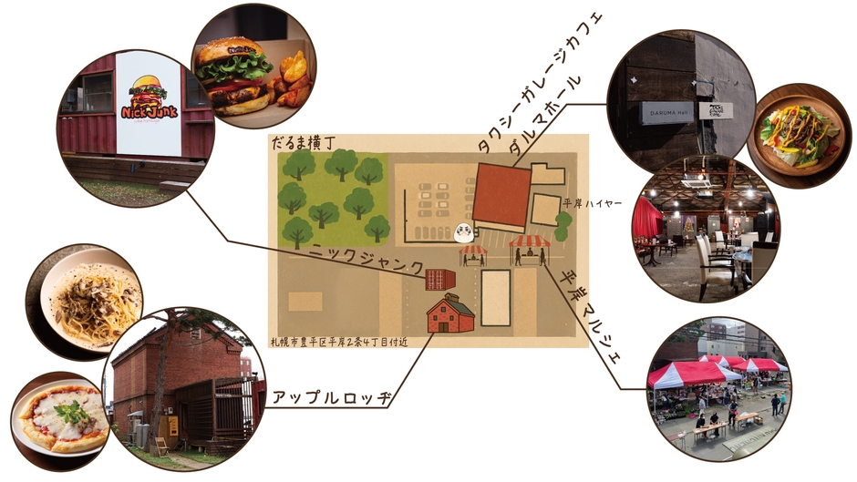 だるま横丁は以下の業態で構成され、平岸ハイヤーの敷地に年間20,000人以上の来訪を見込む地域プラットフォームとして誕生しました。