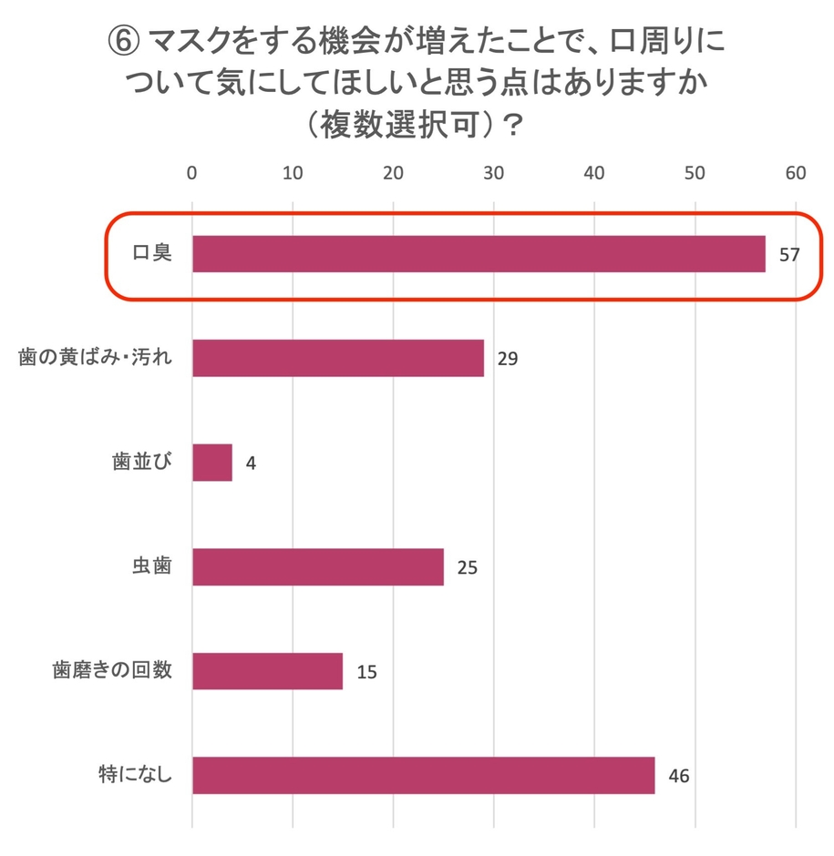 口と言っても様々な要素がありますが、その中でも特に気になるのは口臭、つまりにおいという回答が最多でした。また口まわりでもう1つ、ひげについてコロナ以前と現在では、手入れの頻度が下がったという声も多く挙がりました。マスクを人前で外す機会が少ないからこそ、中途半端に伸びた状態が増え、それが目についてしまうためです。きちんと剃ってほしい、伸ばすにしても整えてほしいなど、コロナ禍でも清潔感を維持してほしいというのが主婦・ママの本音のようです。
