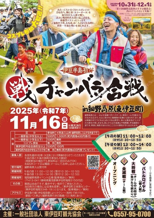 11月16日(日) 戦チャンバラ合戦 2025 in 細野高原、もちまき/広大な高原を利用した参加型チャンバラ合戦。雨天時は東伊豆町立体育センターで開催。【現在参加者募集中!】