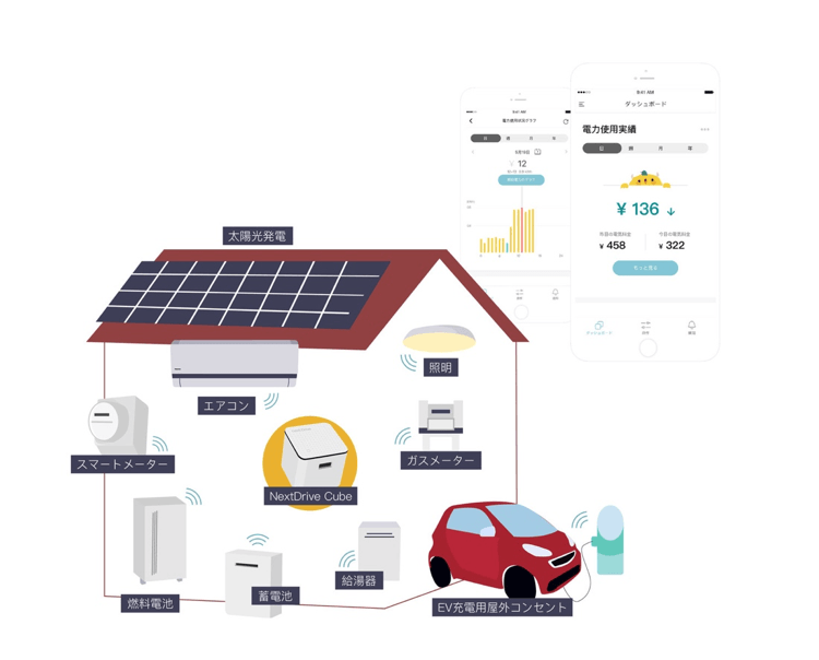 NextDrive社製「Cube J」はECHONET Lite AIF認証を取得したことにより、専用のスマートフォンアプリ「Ecogenie」により、住宅内の電力使用状況をモニタリングし電力の見える化に対応するとともに、E重点8機器を統合的に管理制御することと自動制御化することでZEHを実現します。