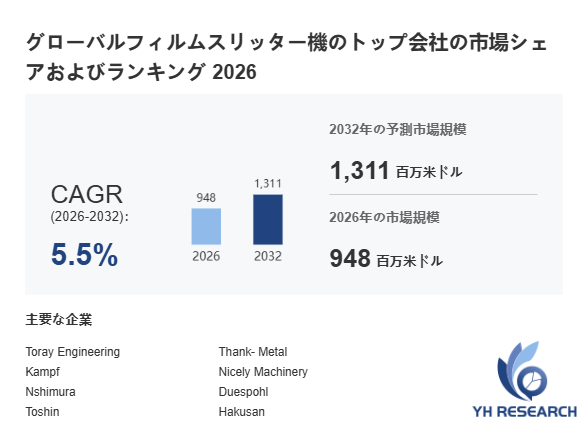 YHResearch調査チームの最新レポート「グローバルフィルムスリッター機のトップ会社の市場シェアおよびランキング 2026」によると、2026年の948百万米ドルから2032年には1311百万米ドルに成長し、2026年から2032年の間にCAGRは5.5%になると予測されています。