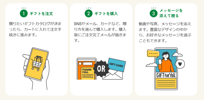 住所を知らなくても、SNSやメールで簡単にギフトを贈ることができる仕組みです。お互いの名前や住所は表示されない、気軽にギフトを贈り合うことができます。動画やメッセージを添えることが出来るので、お祝いや感謝の気持ちを伝えるのにぴったりです。