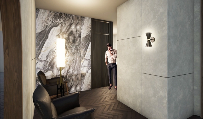 ラグジュアリーホテルのようなエントランス空間では、伝統あるクラシカルな様式を基本デザインとしながら、銅板など異素材の組み合わせにより先進性を感じる空間です。また、間接照明を多用し、優しい心地の良い空間構成としています。