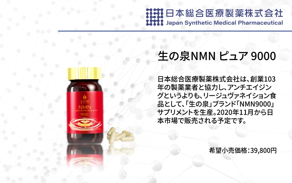日本総合医療製薬株式会社(本社:大阪市中央区、代表取締役:松原 智哉)は、今、話題のNMN(ニコチンアミドモノヌクレオチド)を9,000mg配合したサプリメント商品《生の泉(せいのせん)NMNピュア9000》を2020年11月12日(木)より発売いたします。