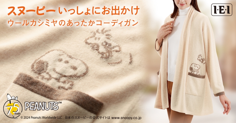 <スヌーピー いっしょにお出かけ>ウールカシミヤのあったかコーディガンは、I・E・I オリジナルショップにて販売いたします。