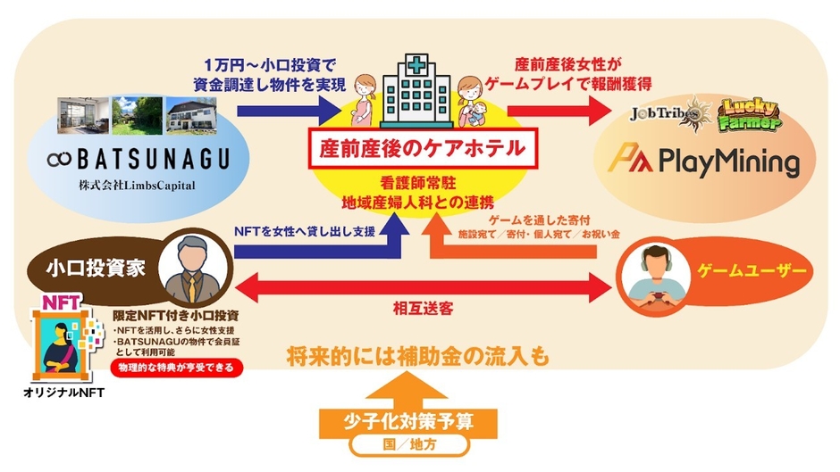 両社はアプローチは異なりますが同じ目標を持つ事業体です。例えば「少子化対策」という社会課題に対して、「産前産後の女性にやさしい不動産物件」のクラウドファンディングをNFTゲームを活用し盛り上げるなど、実行力ある社会課題解決の取り組みを進めていく予定です。
