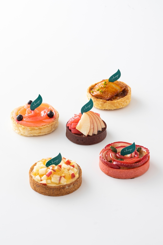 おすすめ商品はりんごのタルト5種(アップルティーの薔薇タルト、青りんごのキャラメルタルト、りんごとカシスのプリンタルト、紅玉のショコラタルト、抹茶ティラミスのりんごタルト)各540円。それぞれに入っている食材の味や色に合わせて青森県産の様々なりんごを使用し、色鮮やかで華やかな同店舗限定商品です。