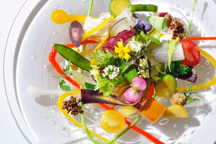 八ヶ岳の野菜畑を表現した代表的な一皿で、鮮やかな見た目が特徴です。アスパラガスやビーツなど30種類の野菜や、アマランサスやたかきび、エゴマなどの雑穀をナッツの風味が香るコンディメントと合わせました。色鮮やかなパプリカ、人参、キャベツ、蕪のソースとともに味わえます。