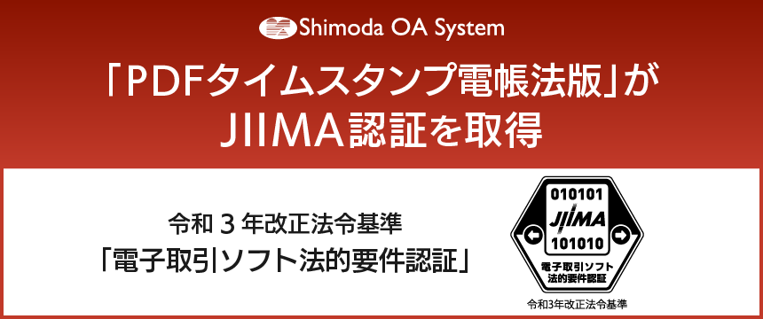 株式会社下田OAシステム(代表取締役社長:杉本 憲一)は、当社ソフトウェア「PDFタイムスタンプ 電帳法版」が、公益社団法人日本文書情報マネジメント協会(JIIMA)による「電子取引ソフト法的要件認証」を、取得したことをお知らせいたします。