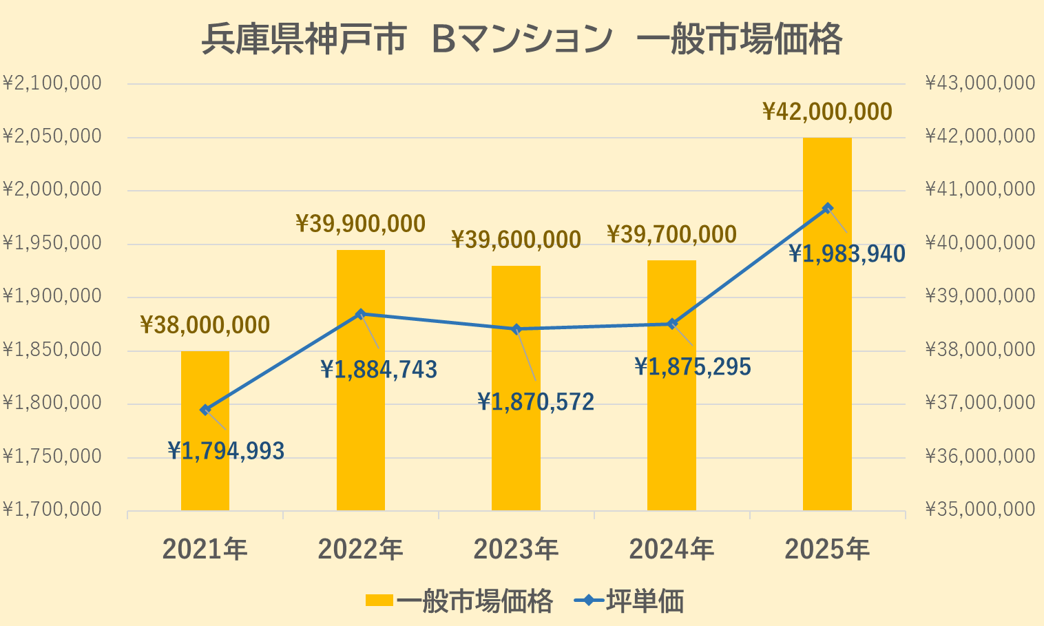 2021年は3,800万円(@179万円)でしたが、翌2022年は3,990万円(@188万円)と上昇、2023年は3,960万円(@187万円)と微減し、2024年は3,970万円(@187万円)とほぼ横ばい、2025年は4,200万円(@198万円)と大きく上昇したことがわかります。