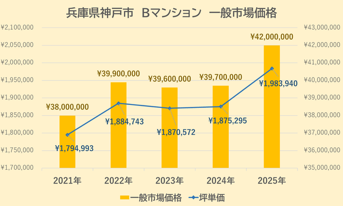 Bマンションの一般市場価格・坪単価の推移は上記【図4】の通りです。