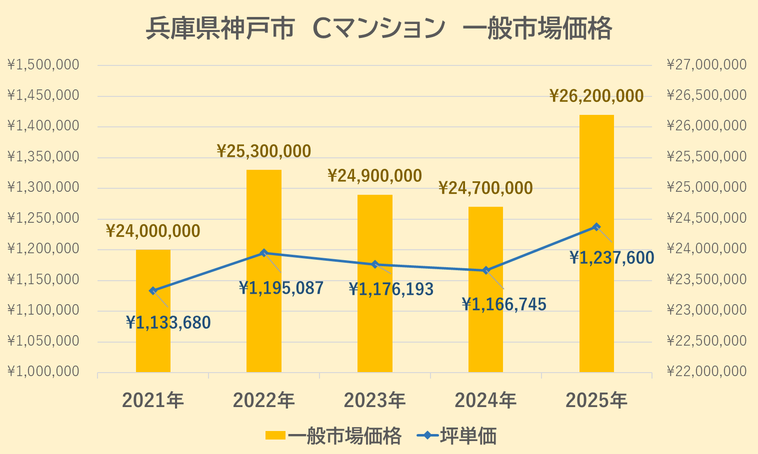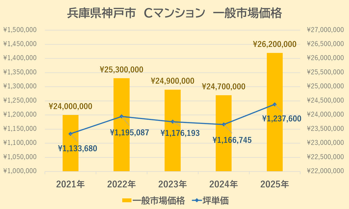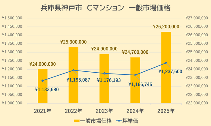 Cマンションの一般市場価格・坪単価の推移は上記【図5】の通りです。