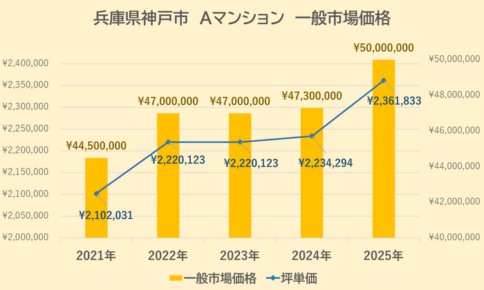 Aマンションの一般市場価格・坪単価の推移は上記【図3】の通りです。