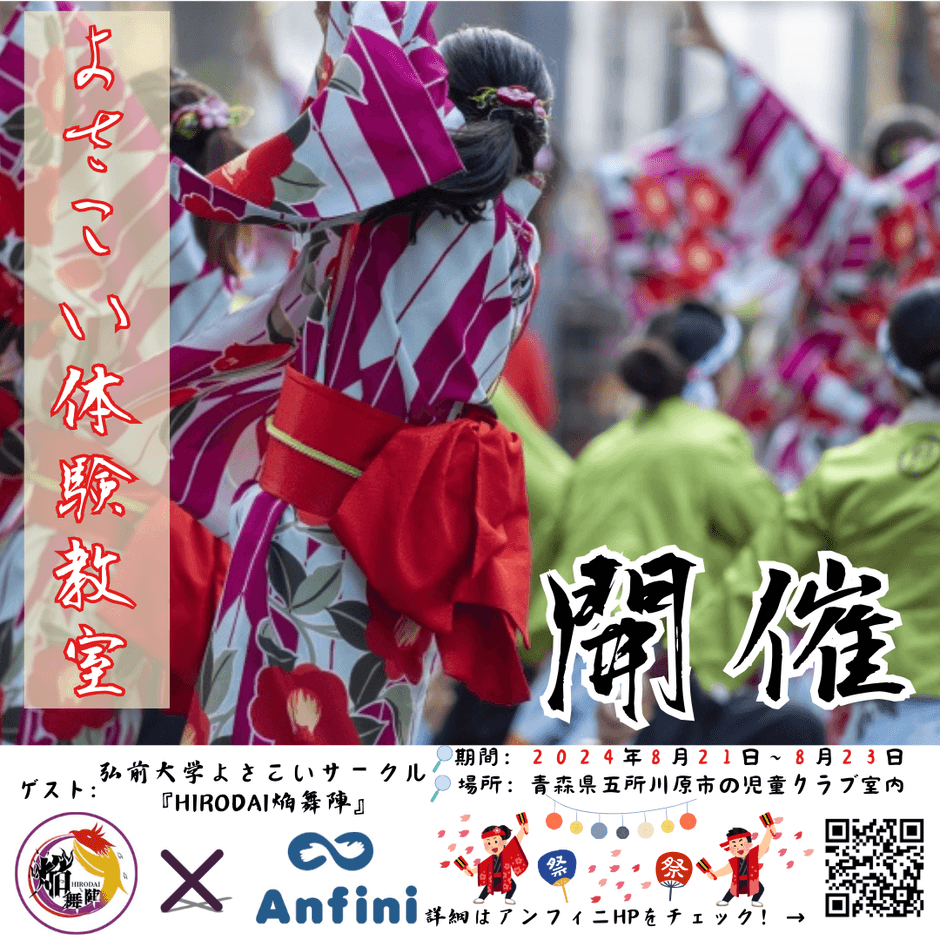 株式会社アンフィニ(所在地:茨城県つくばみらい市、代表取締役:片山 章彦)は、『夏休みを過ごす子どもたちに、地域に愛されているよさこい踊りの素晴らしさを伝えたい』という強い想いから、当社が受託運営する青森県の放課後児童クラブに在籍する児童及びその保護者を対象に、親子で参加できるよさこい体験教室を2024年8月21日~8月23日に開催します。