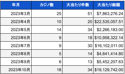 2023年10月米国カジノにおけるジャックポット当選件数と総額