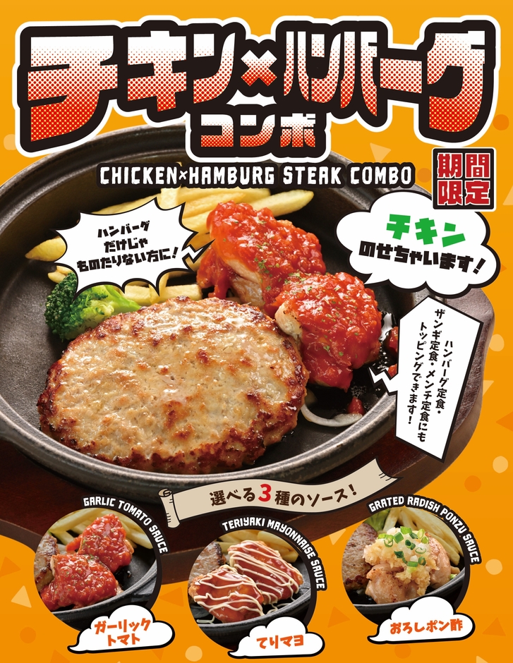 ファイヤーバーグのハンバーグに相性抜群のグリルチキンをプラスした最強コンボメニューが登場!チキンは、「ガーリックトマト」「てりマヨ」「おろしポン酢」の3種類のソースからお選びいただけます。いずれも当店自慢の羽釜で炊いたご飯との相性が抜群!これからの暑い季節でもしっかり食欲をそそる、ボリューム満点の期間限定メニューです!