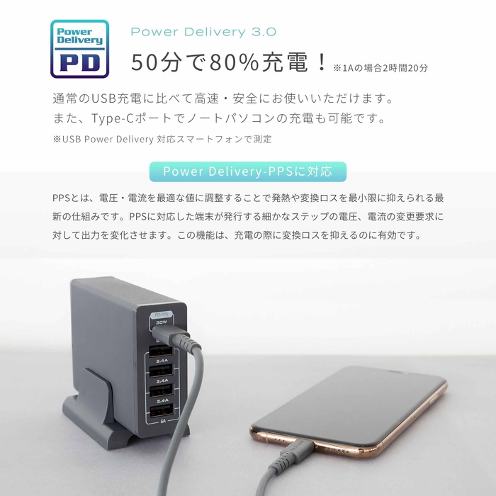 さらにPower Delivery3.0にはオプションとしてPPS(※)が追加され、よりハイパワーの充電を安心・安全に行うことが出来るようになりました。