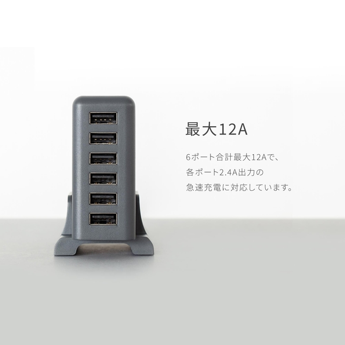 ▼スマートフォンやタブレットなどを6台同時充電可能で、合計最大12A出力対応